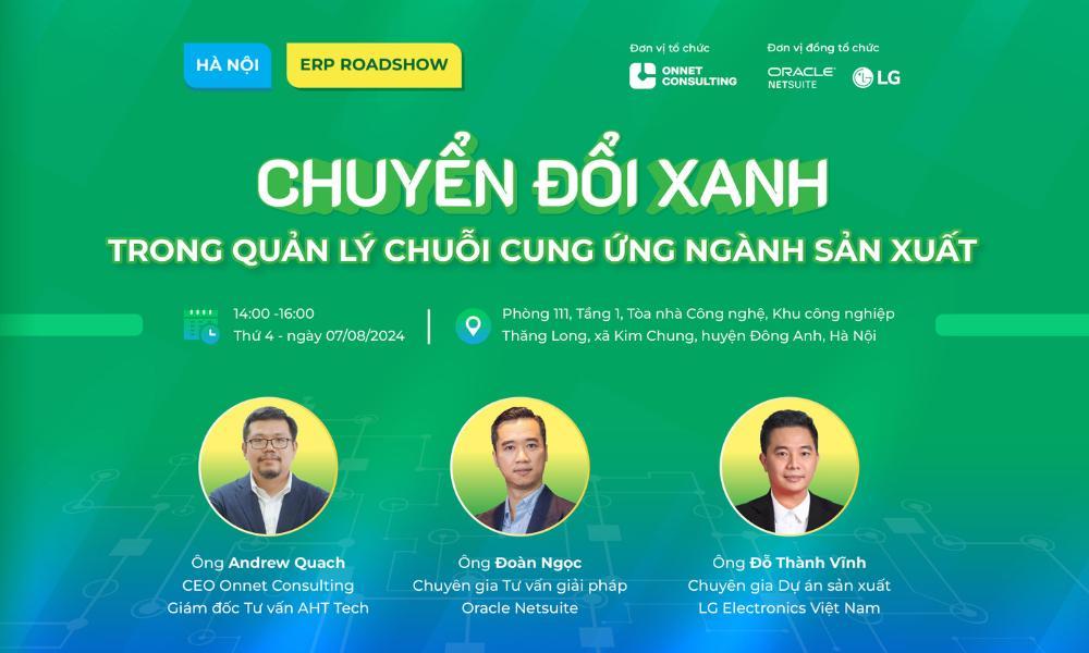 ERP Roadshow là chuỗi sự kiện được tổ chức bởi A1 Consulting cùng Oracle Netsuite và LG Electronics Việt Nam hứa hẹn sẽ mang đến góc nhìn thực tiễn và kinh nghiệm chuyển đổi xanh trong quản lý chuỗi cung ứng ngành sản xuất.